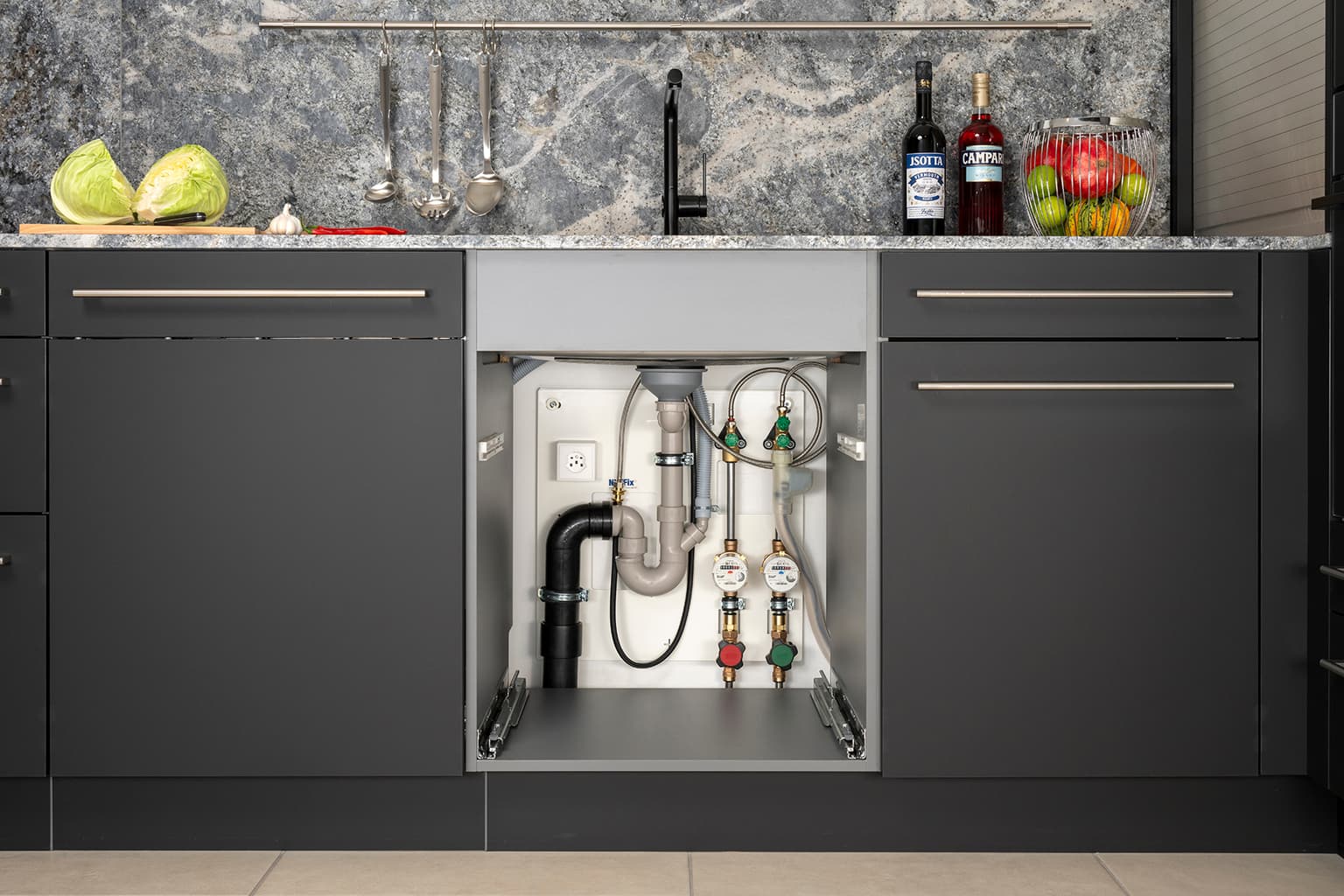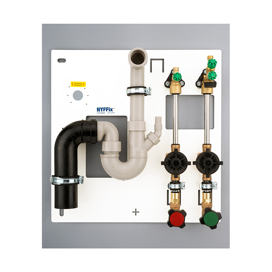 Die von Nyffenegger Armaturen selbst entwickelte Installationsplatte für das Küchenfach bringt viele Vorteile: Die Armaturen – darunter neu ein Doppelventil mit zwei Einzel-Absperrungen – sind auf der Metallplatte vormontiert, der PE-Bogen ist mit der Steckmuffe verschweisst, der Anschlussbogen der Spültischgarnitur angefast – Sie müssen lediglich viermal bohren. Danach bewahrt der smarte Bauschutz die Installation vor Verschmutzung – das Original exklusiv bei Nyffenegger Armaturen.